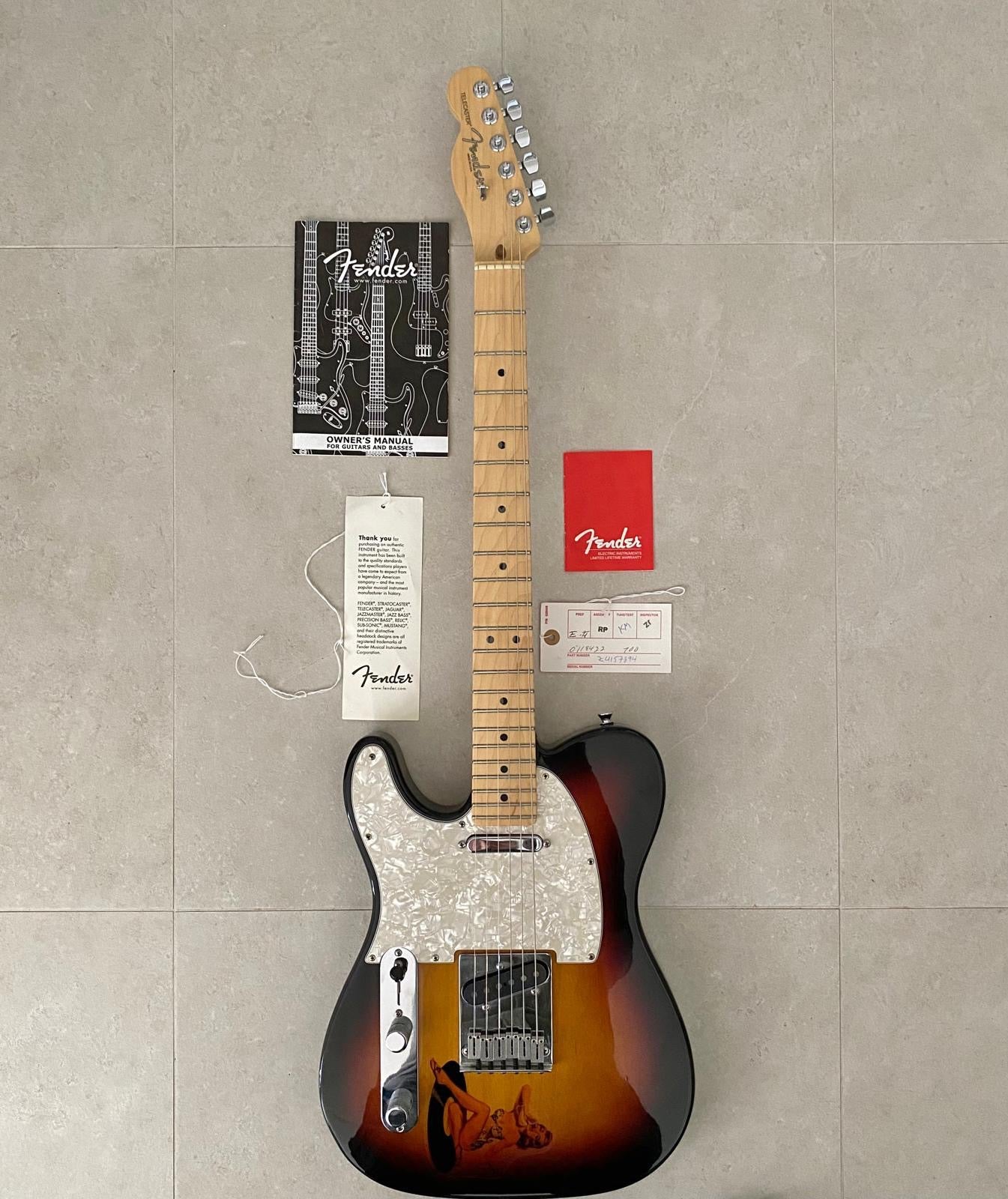 In summary, this instrument is a perfect example of a ‘Time Machine’ guitar as it is very apparent that it has hardly been played.  The lustrous deep burst and the amber tint of the pin-up girl make this Tele very appealing and is a great find for those lefties who find it a great challenge to find a ‘near vintage’ left handed Tele that is this attractive.